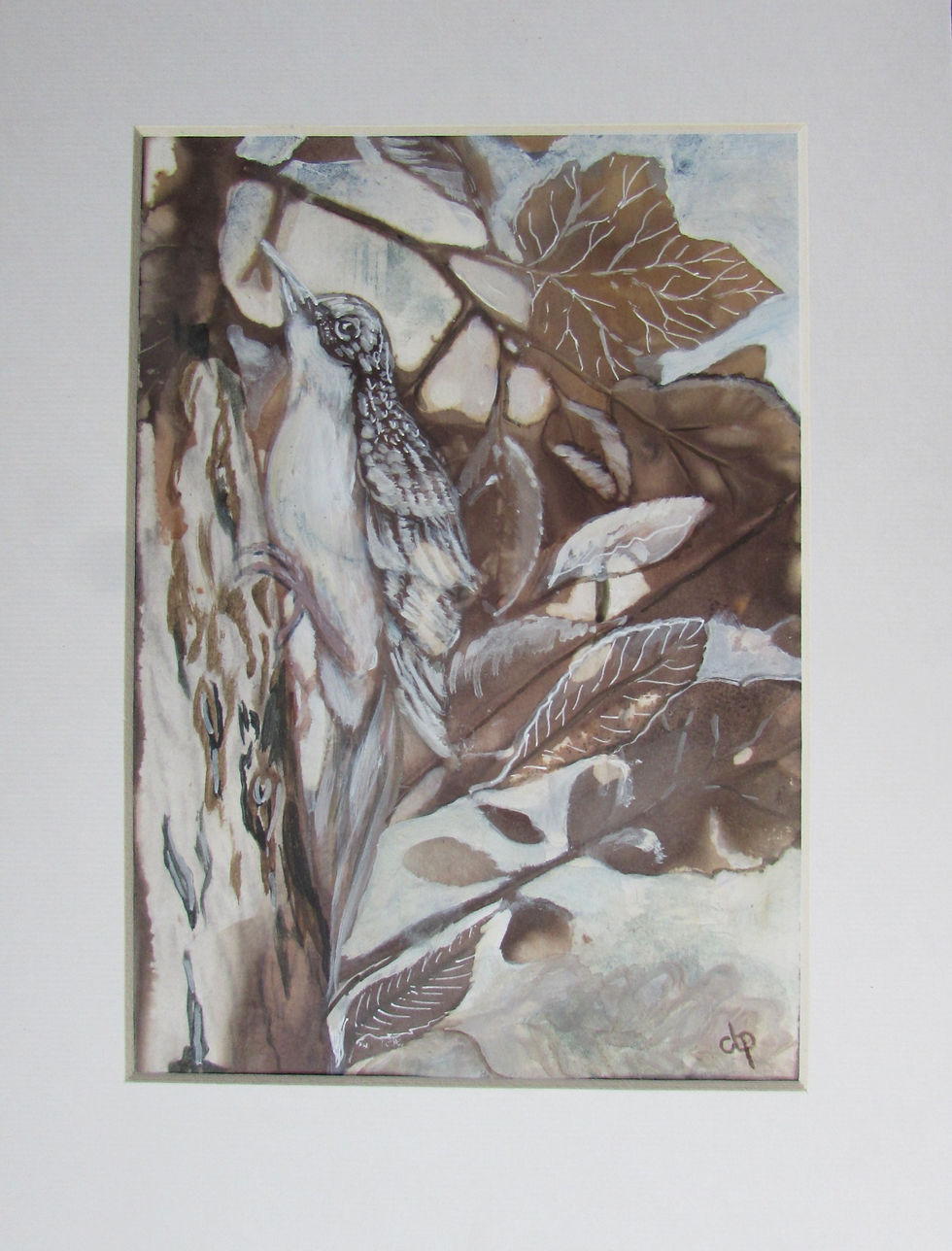 I use natural botanical elements to create eco-friendly contact prints on watercolour paper. I then use paint and watercolour pencils to define and enhance the unpredictable patterns they produce, and to add the birds and other wildlife.